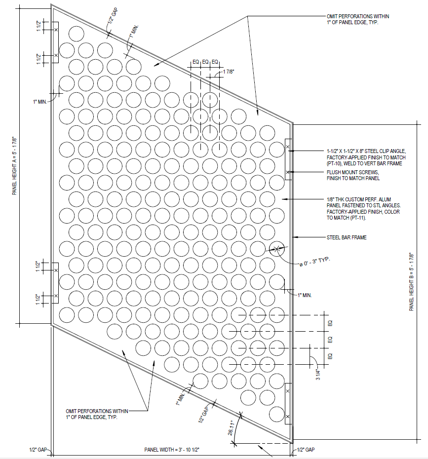 The infill panels feature StellarCraft’s signature circle perforation pattern with approximately 1-inch diameter openings. In total, the project included 337 mild steel panels across 72 unique panel size variations. The architect selected a white finish to complement the surrounding architectural elements and enhance the brightness of the space.